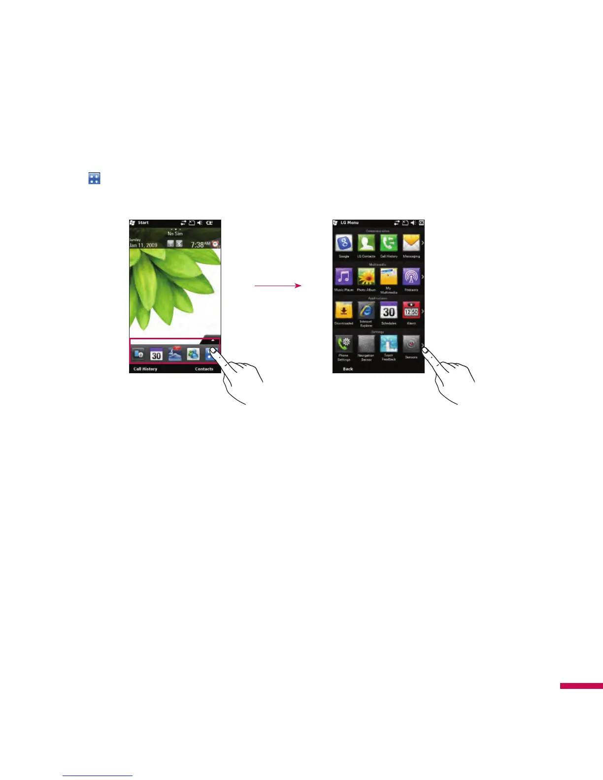 Tap to access the LG Menu. There are features related Communications, Multimedia, Applications,