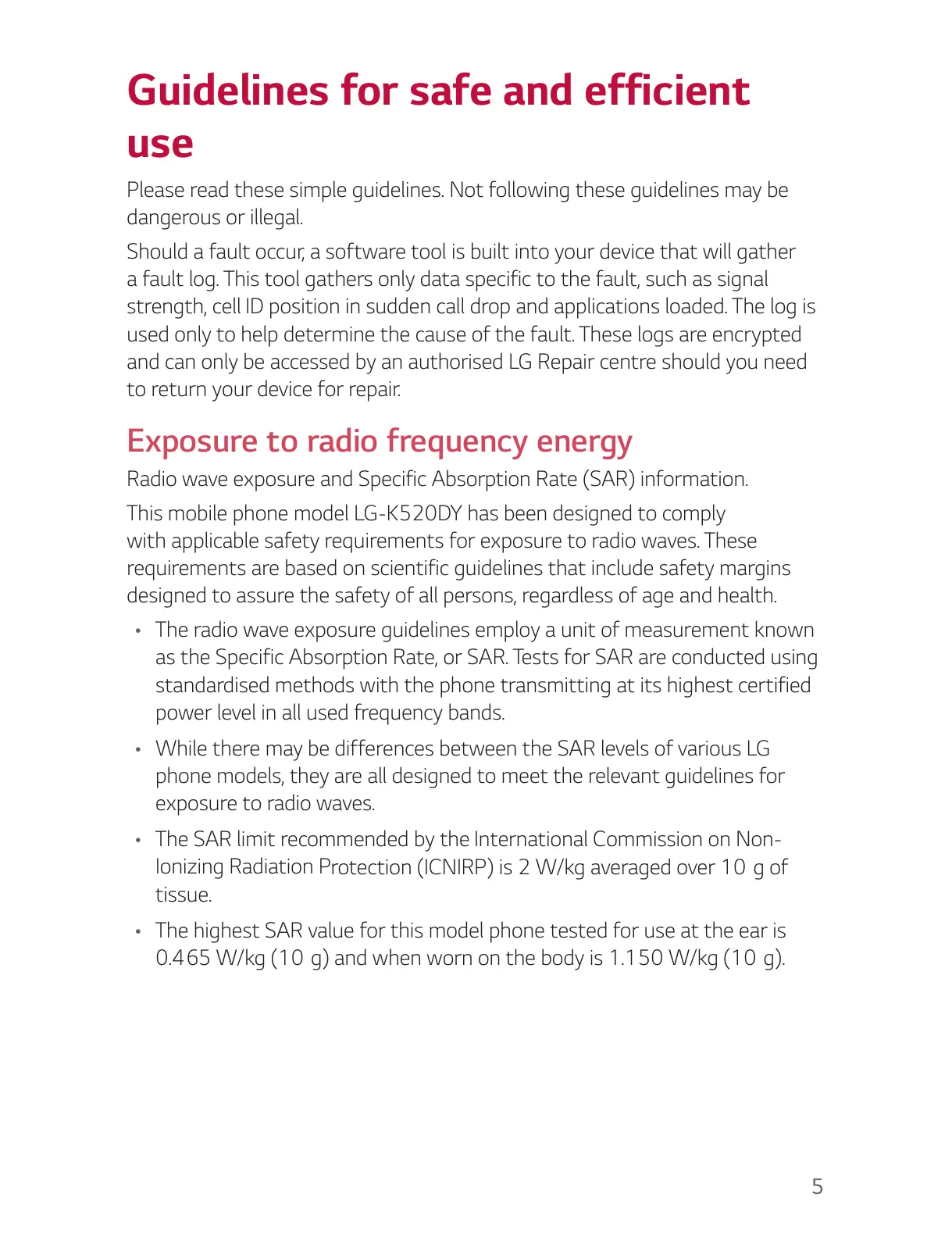 Radio wave exposure and Specific Absorption Rate (SAR) information.
