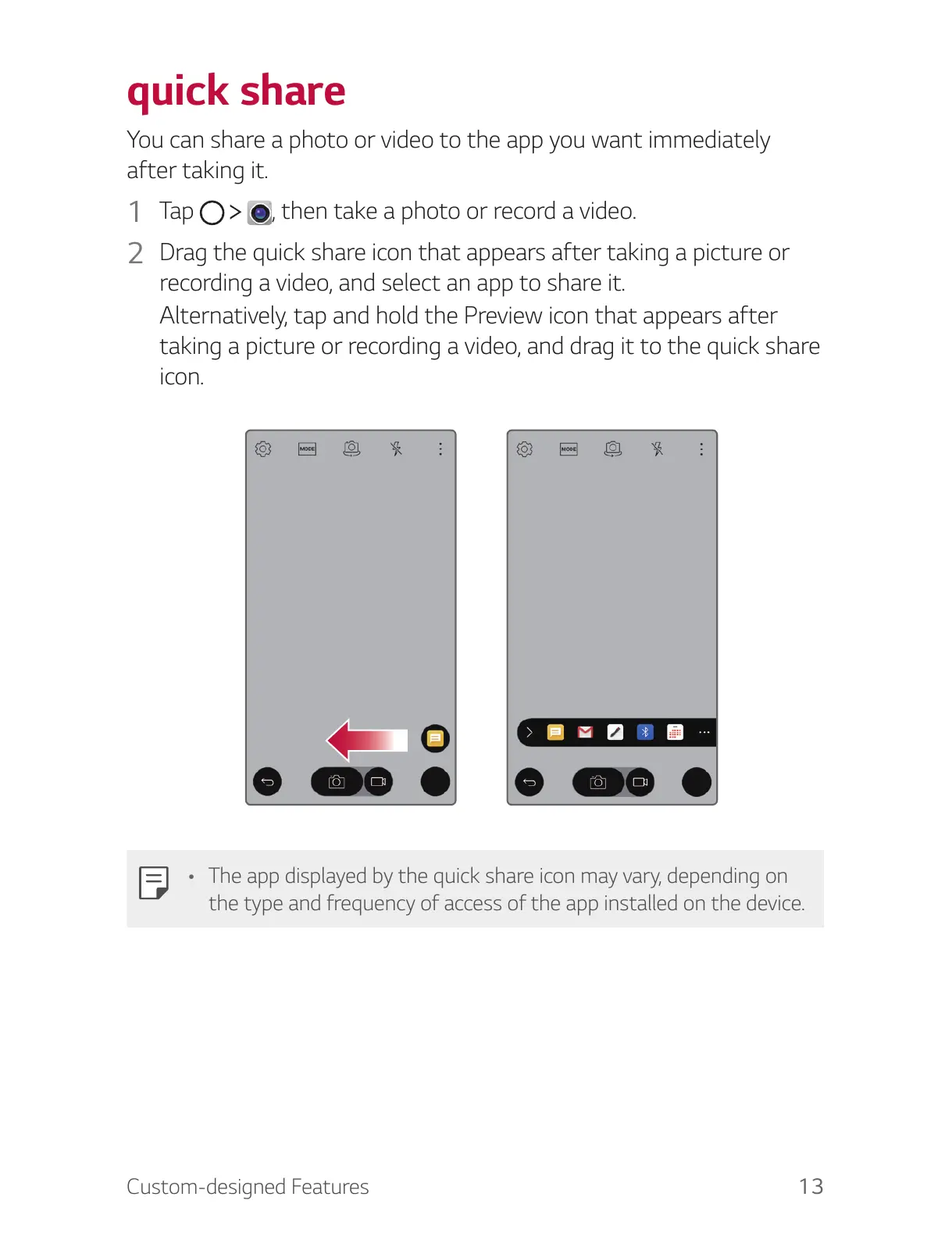 • The app displayed by the quick share icon may vary, depending on