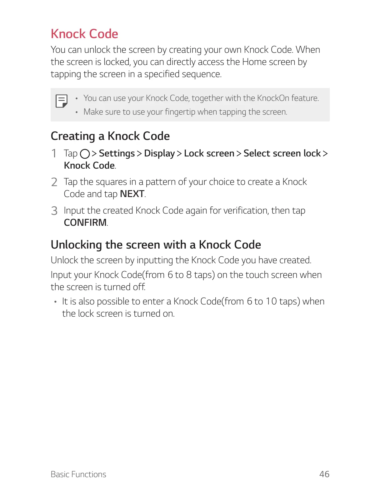 • It is also possible to enter a Knock Code(from 6 to 10 taps) when