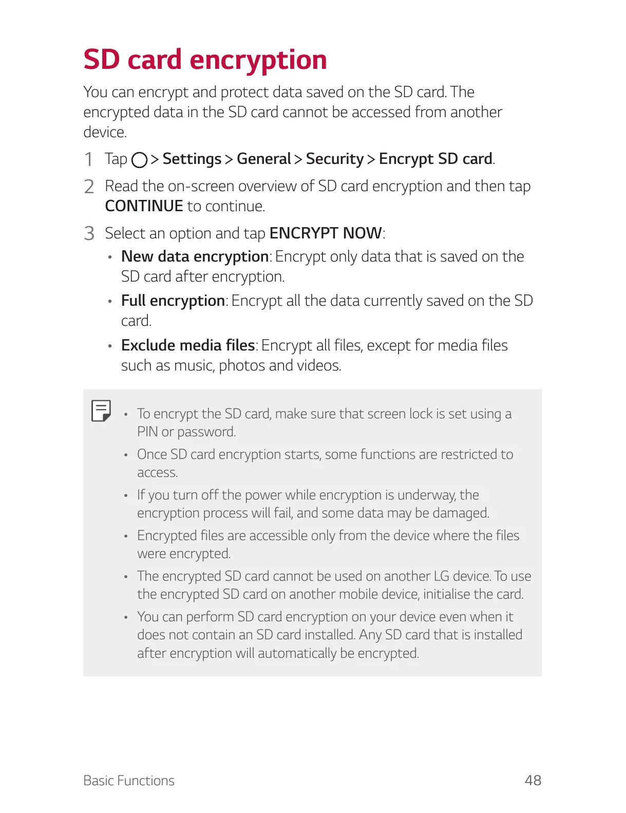 • The encrypted SD card cannot be used on another LG device. To use
