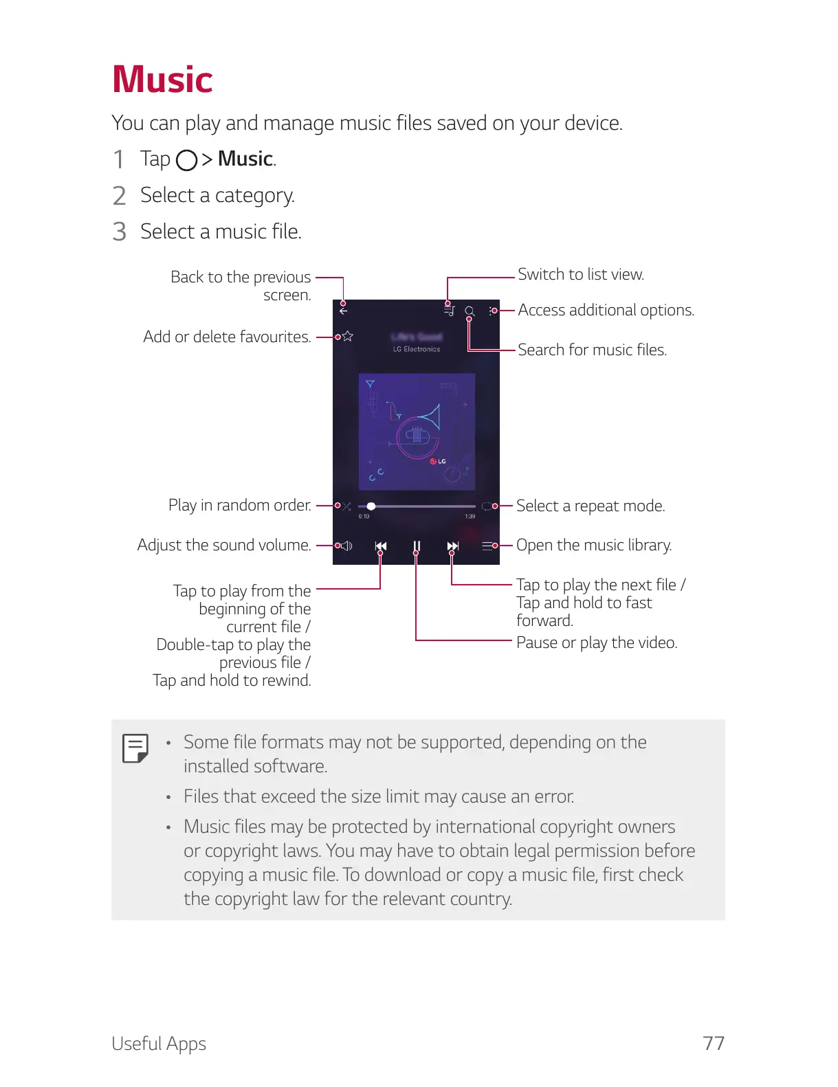 You can play and manage music files saved on your device.