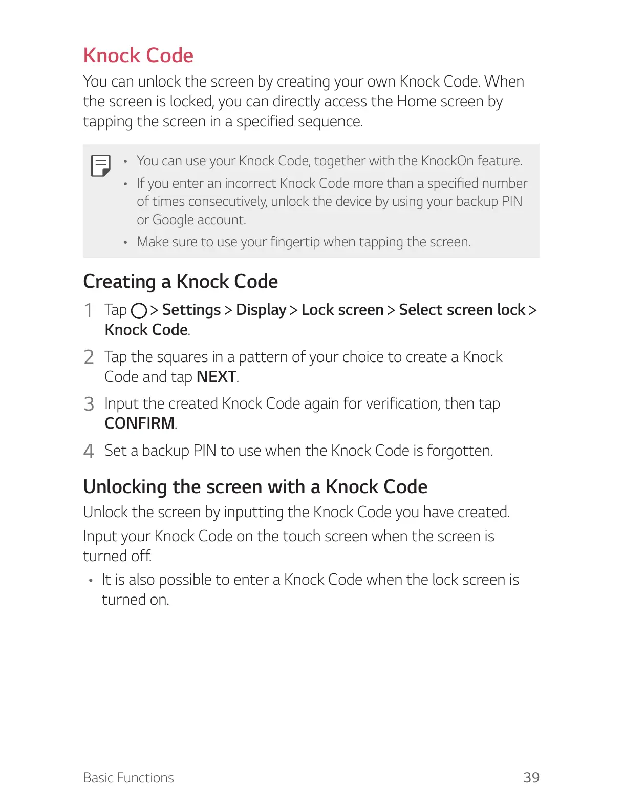 A It is also possible to enter a Knock Code when the lock screen is