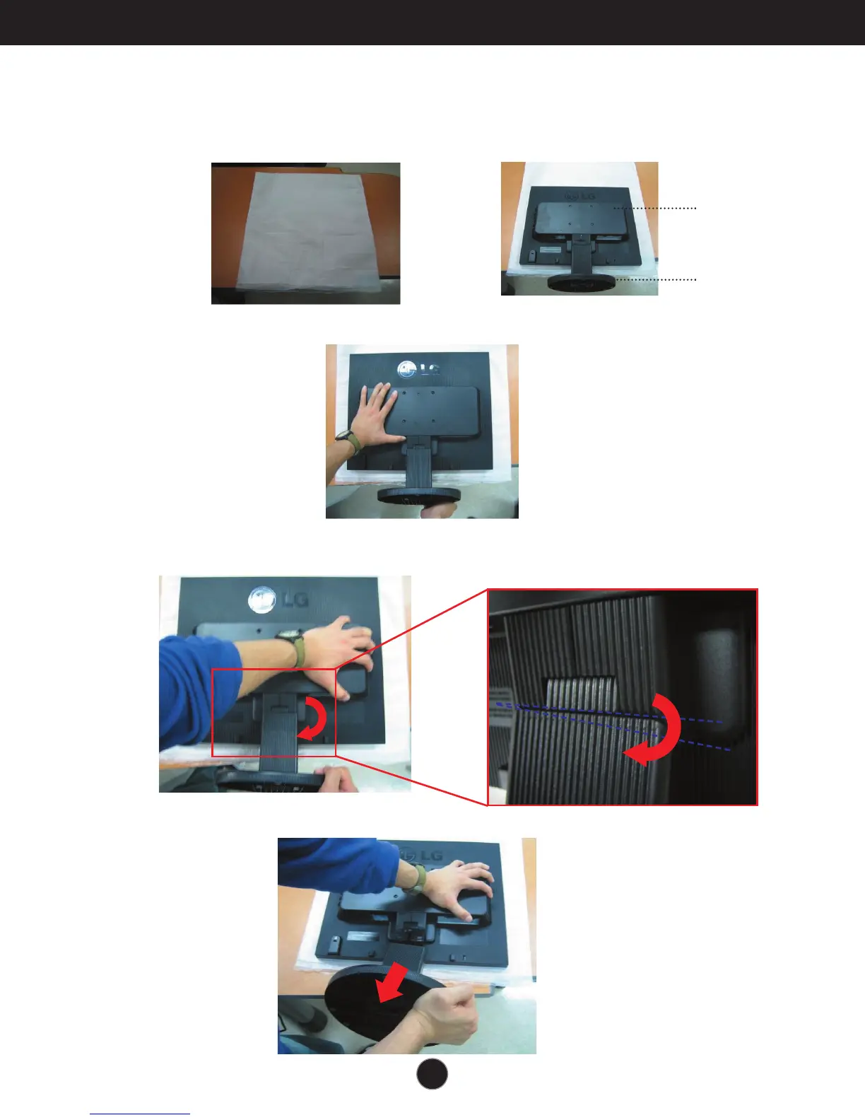 1. Put a cushion or soft cloth on a flat surface. 2. Place the monitor face down on