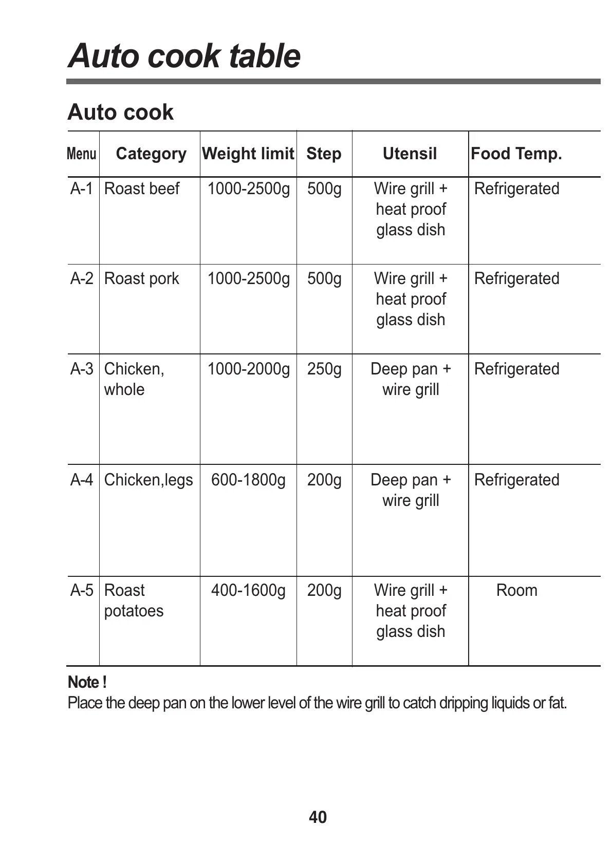 Place the deep pan on the lower level of the wire grill to catch dripping liquids or fat.