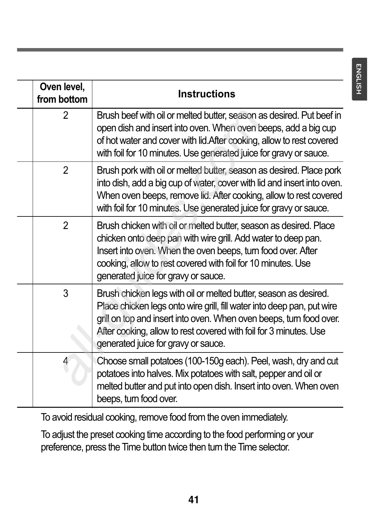 To avoid residual cooking, remove food from the oven immediately.