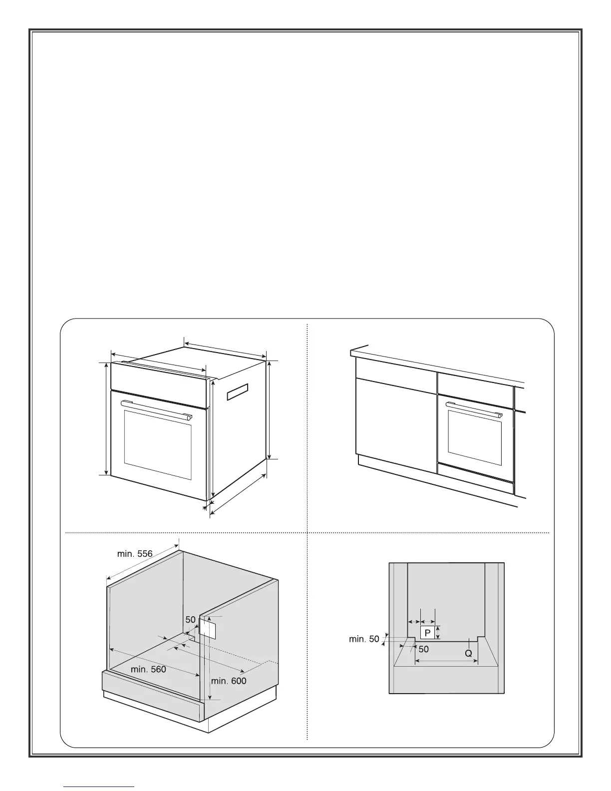 The oven power supply must be located in the back area (P) of kitchen cabinet or outside the