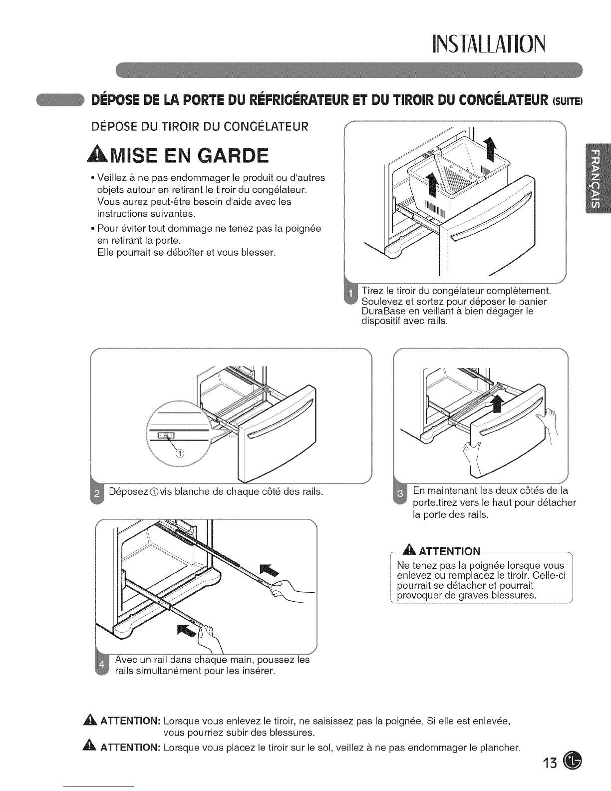 _, ATTENTION: Lorsque vous enlevez le tiroir, ne saisissez pas la poignee. Si elle est enlevee,