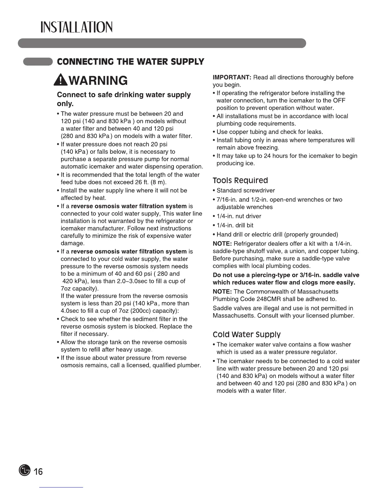 LG LFCS25426* - Connecting the Water Supply