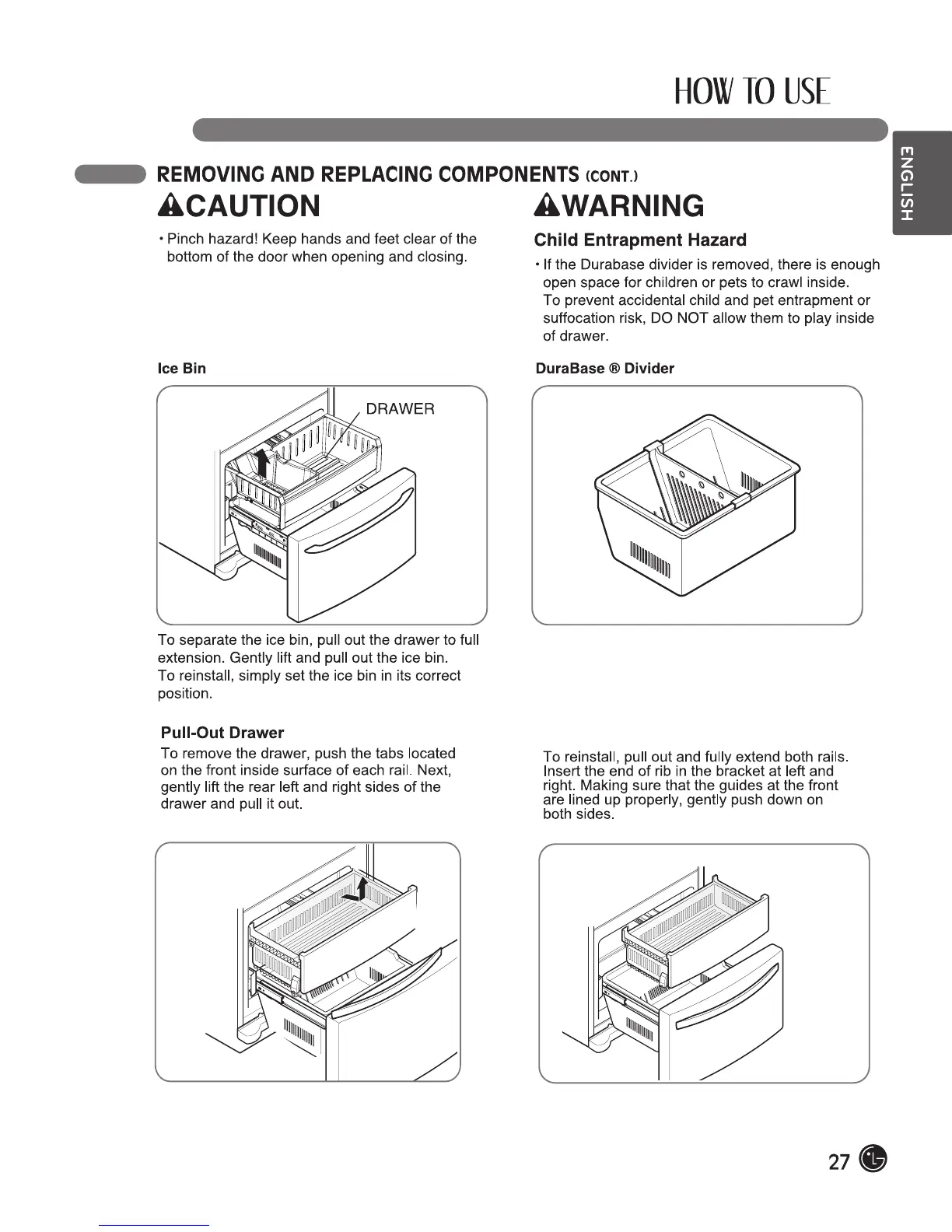 LG LFCS25426* - Child Entrapment Hazard; Ice bin; Durabase Divider; Pull out Drawer