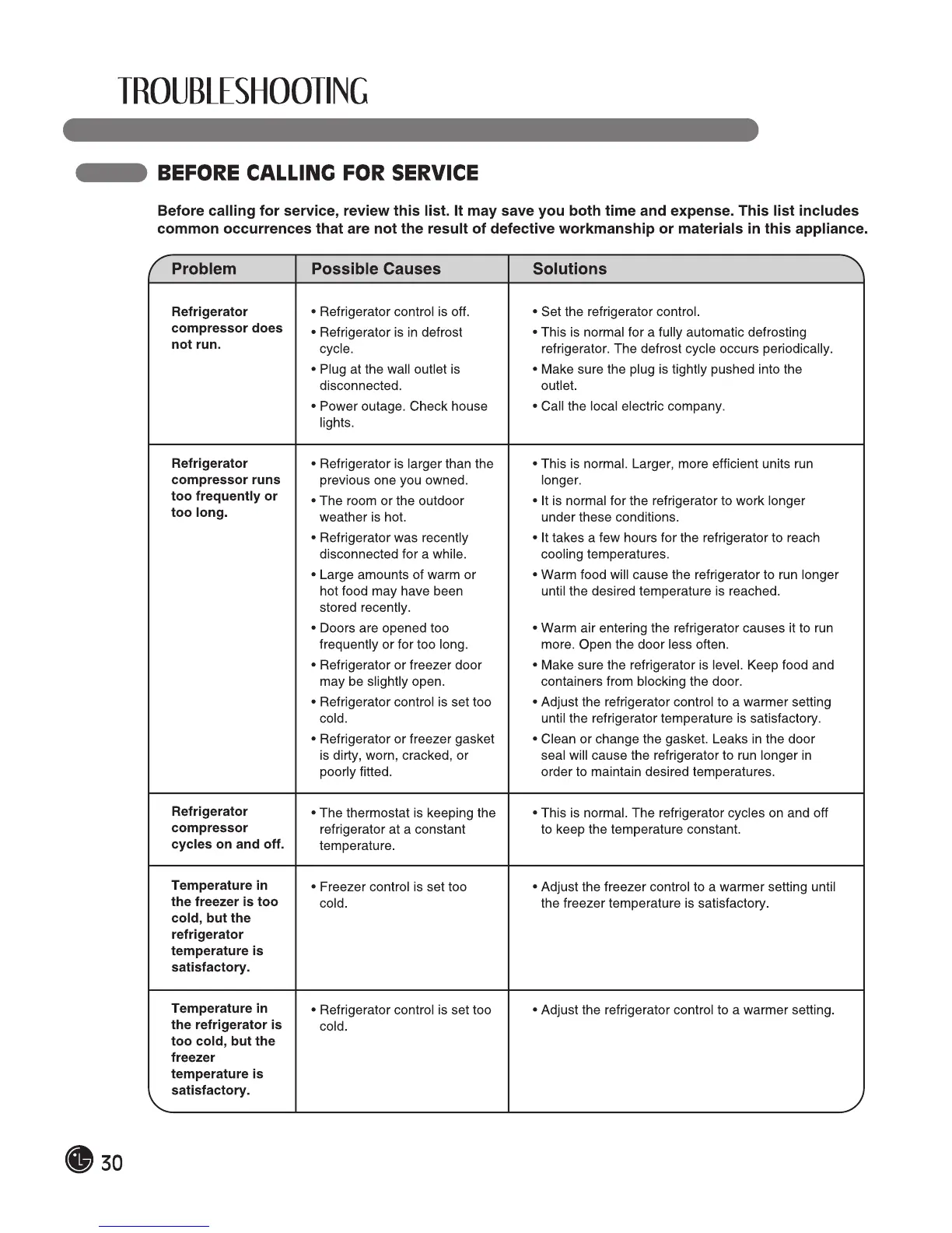 LG LFCS25426* - Troubleshooting; Before Calling for Service