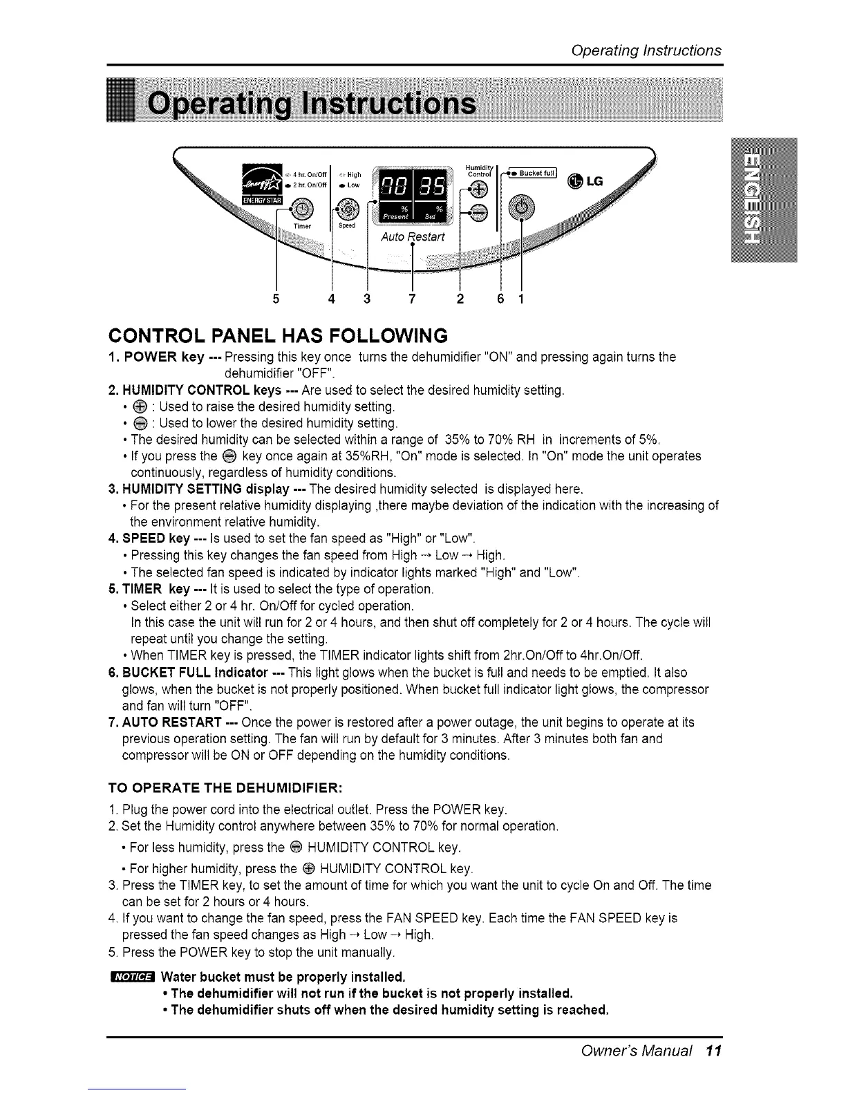 6. BUCKET FULL Indicator --- This light glows when the bucket is full and needs to be emptied. It also