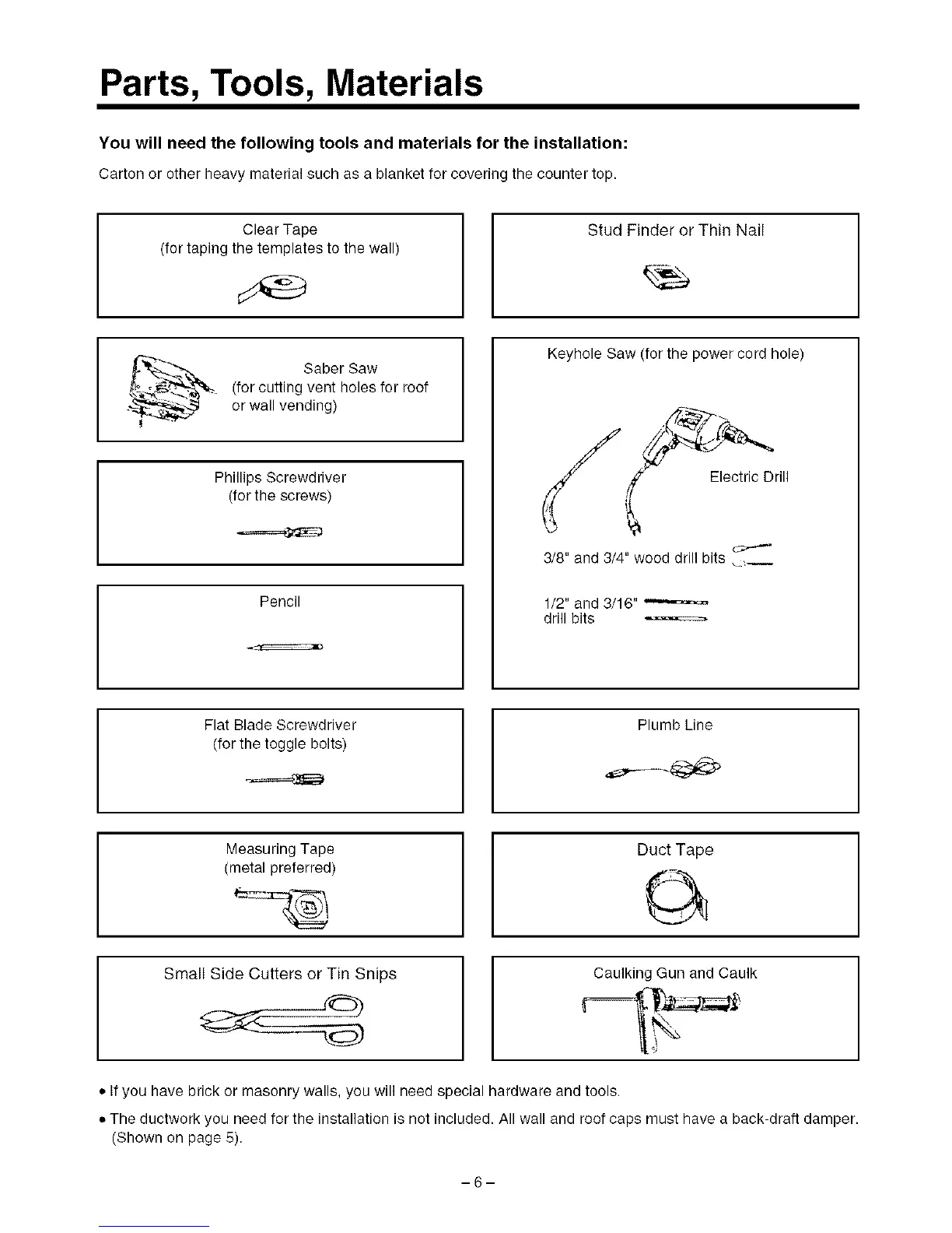 • The ductwork you need for the installation is not included. All wall and roof caps must have a back-draft damper.
