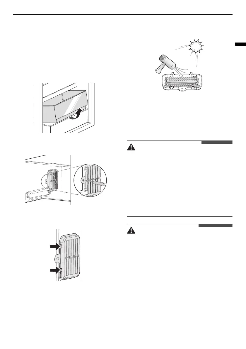 Presione los ganchos del filtro de aire y luego