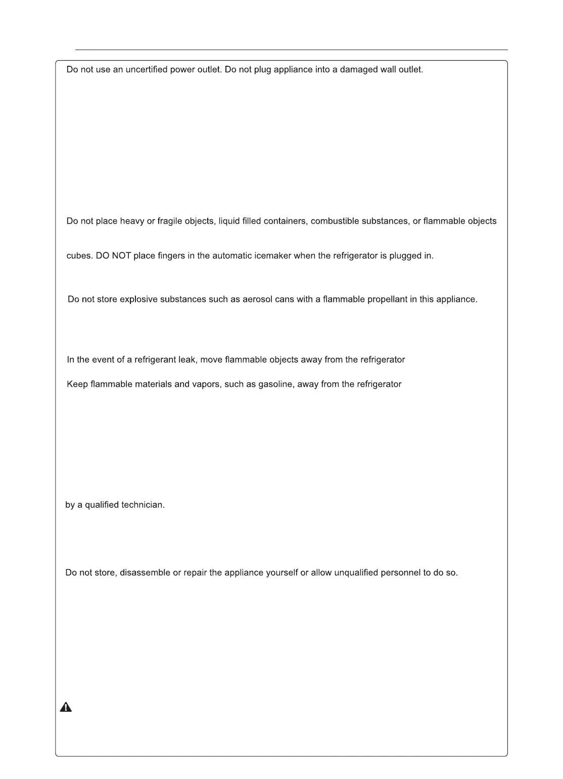 authorized service center before resuming use. Do not touch the refrigerator or power cord of the