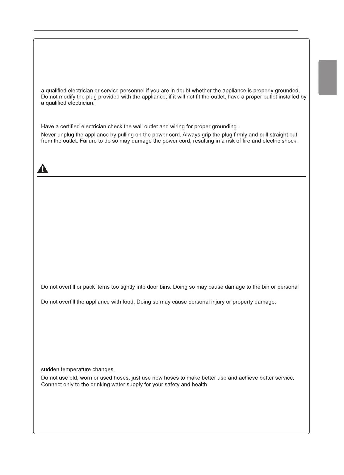 • The refrigerator must be properly installed in accordance with the Installation Instructions.
