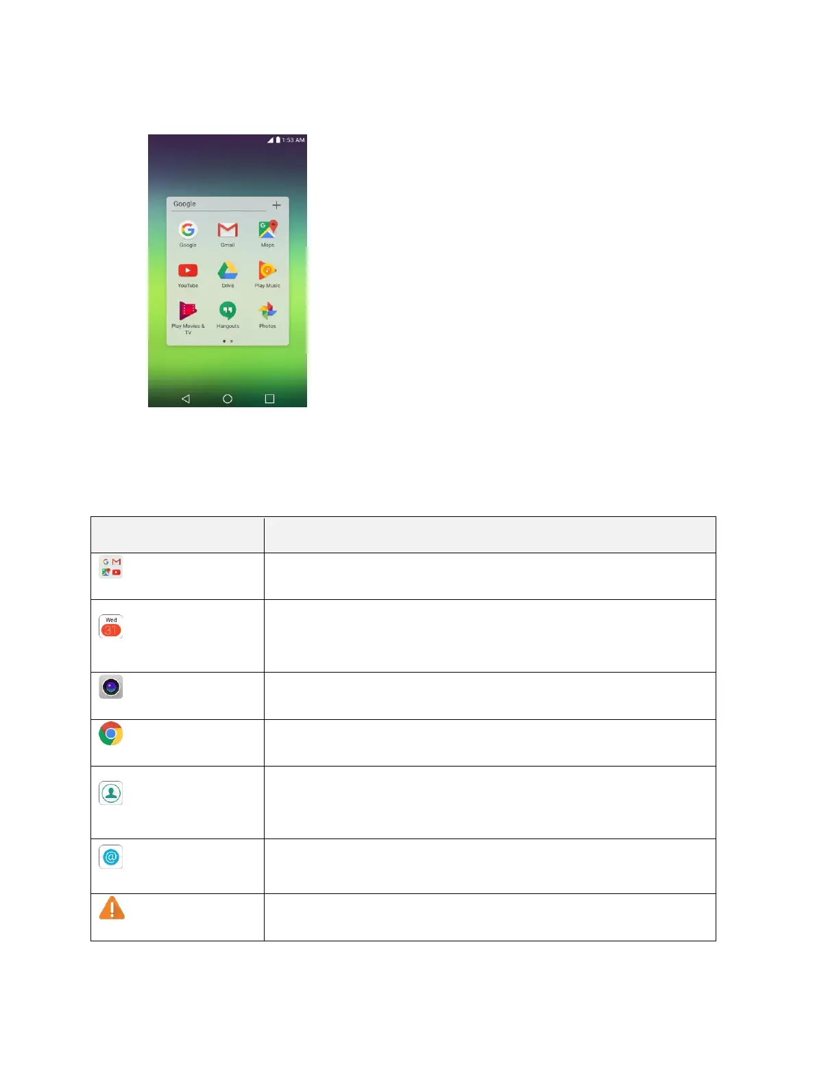 The following table outlines the primary apps that have been preinstalled on your phone.