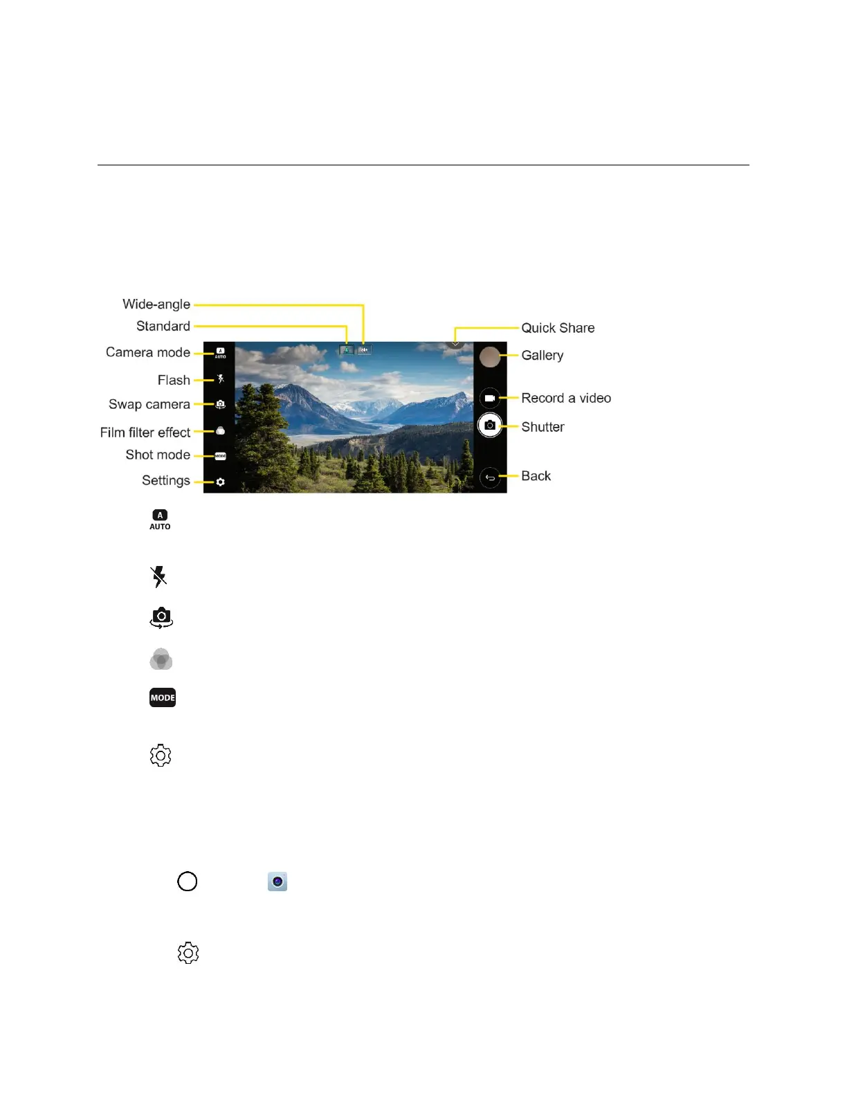 ● Mode to select the mode from: Auto, Panorama, 360 Panorama, Food, Popout, Snap,