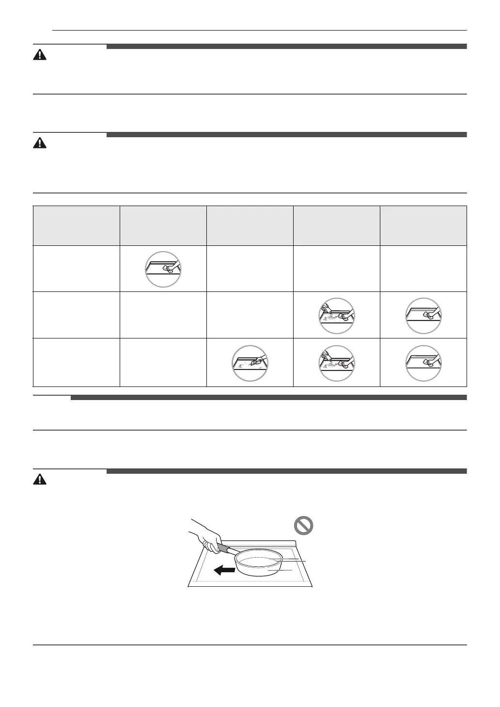 • Do not use cookware if there is foreign matter on the cooktop surface. Always clean the cooktop surface