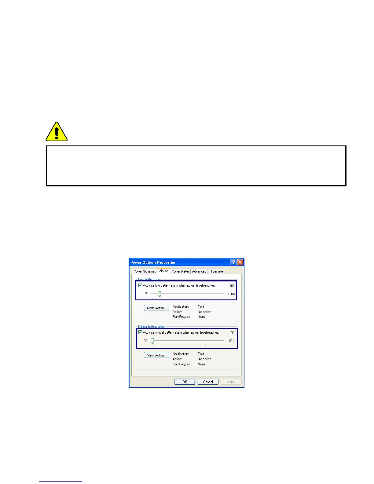 Click [Alarms] tab. Check [Low battery alarm] and [Critical battery alarm],