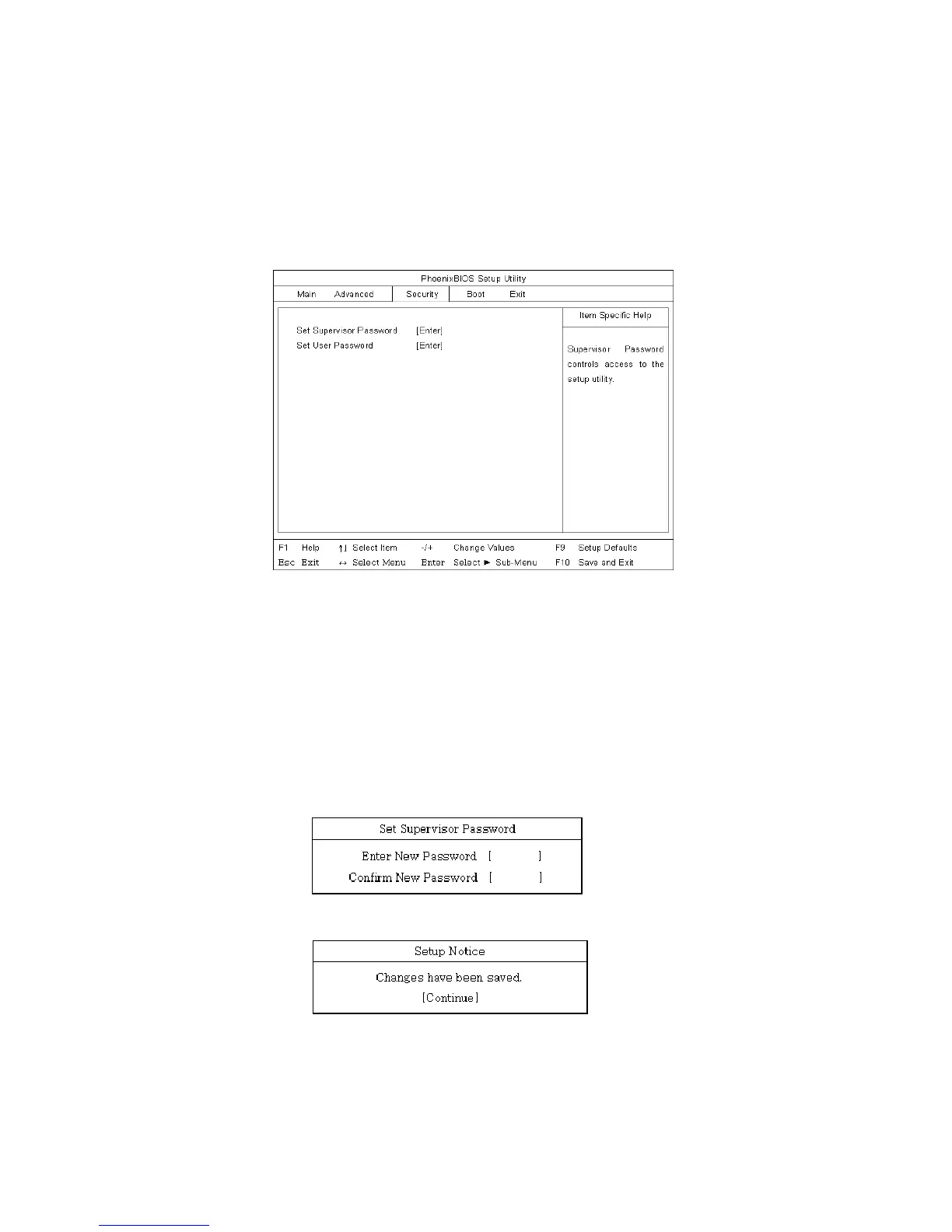 Use arrow keys to select Set Supervisor Password under Security menu, and then