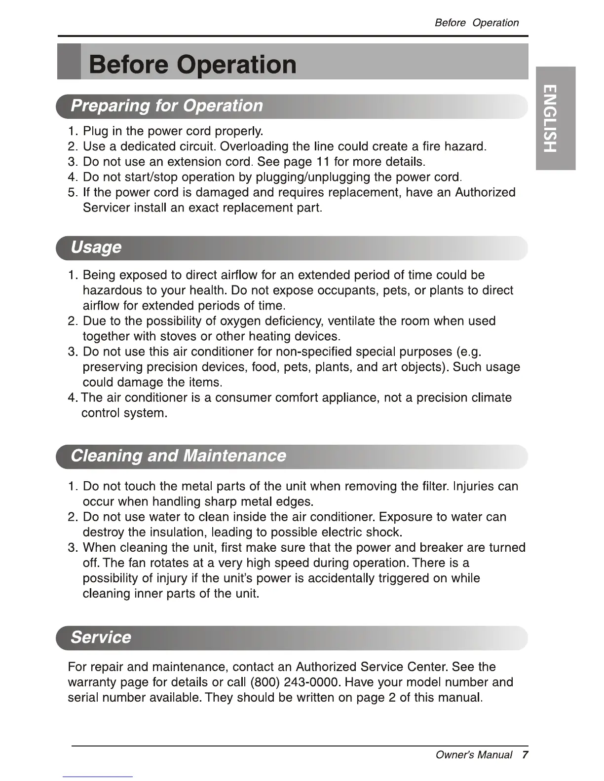 LG LW6511R - Before Operation; Preparing for Operation; Usage and Maintenance Guidelines; Service Contact Information