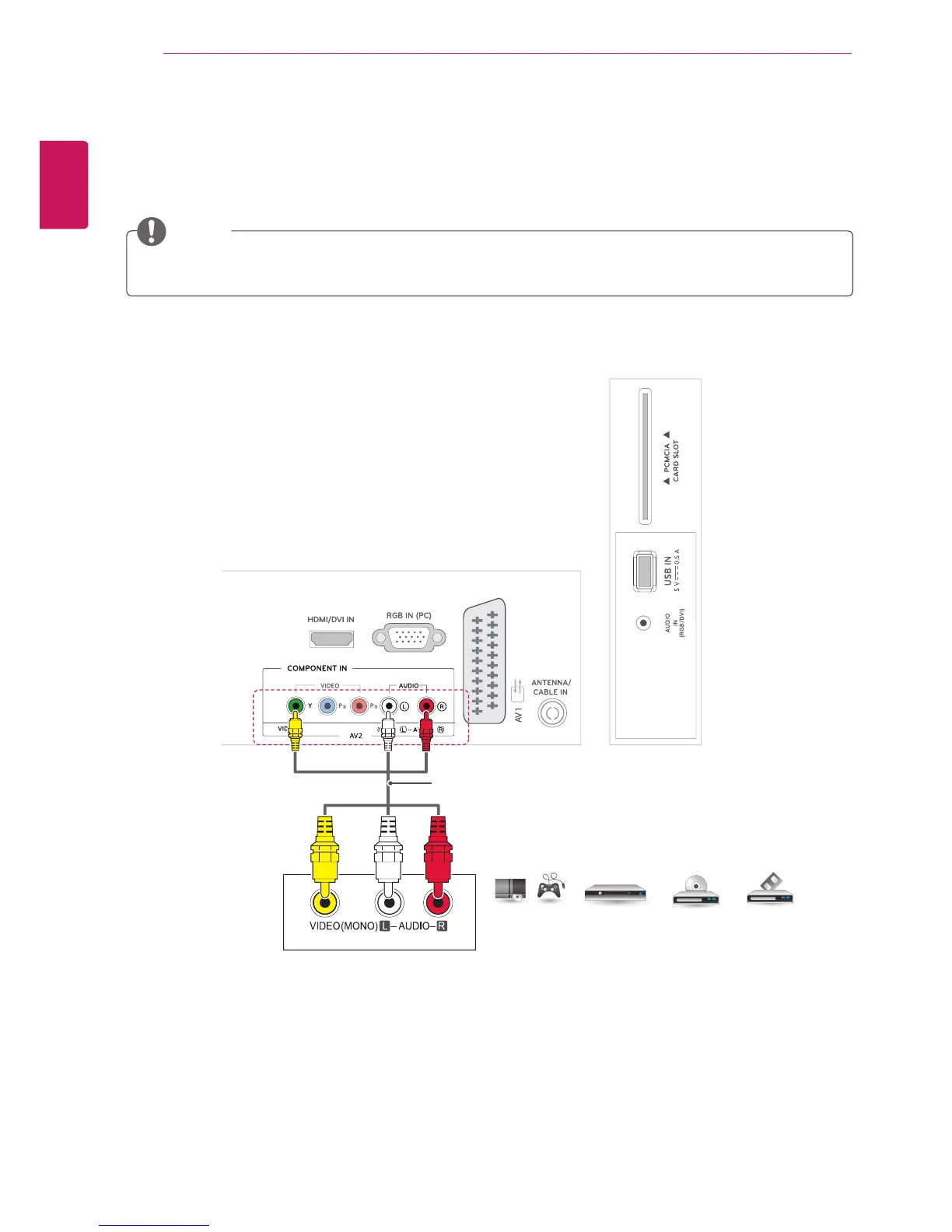 Transmits the analog video and audio signals from an external device to the TV. Connect the external