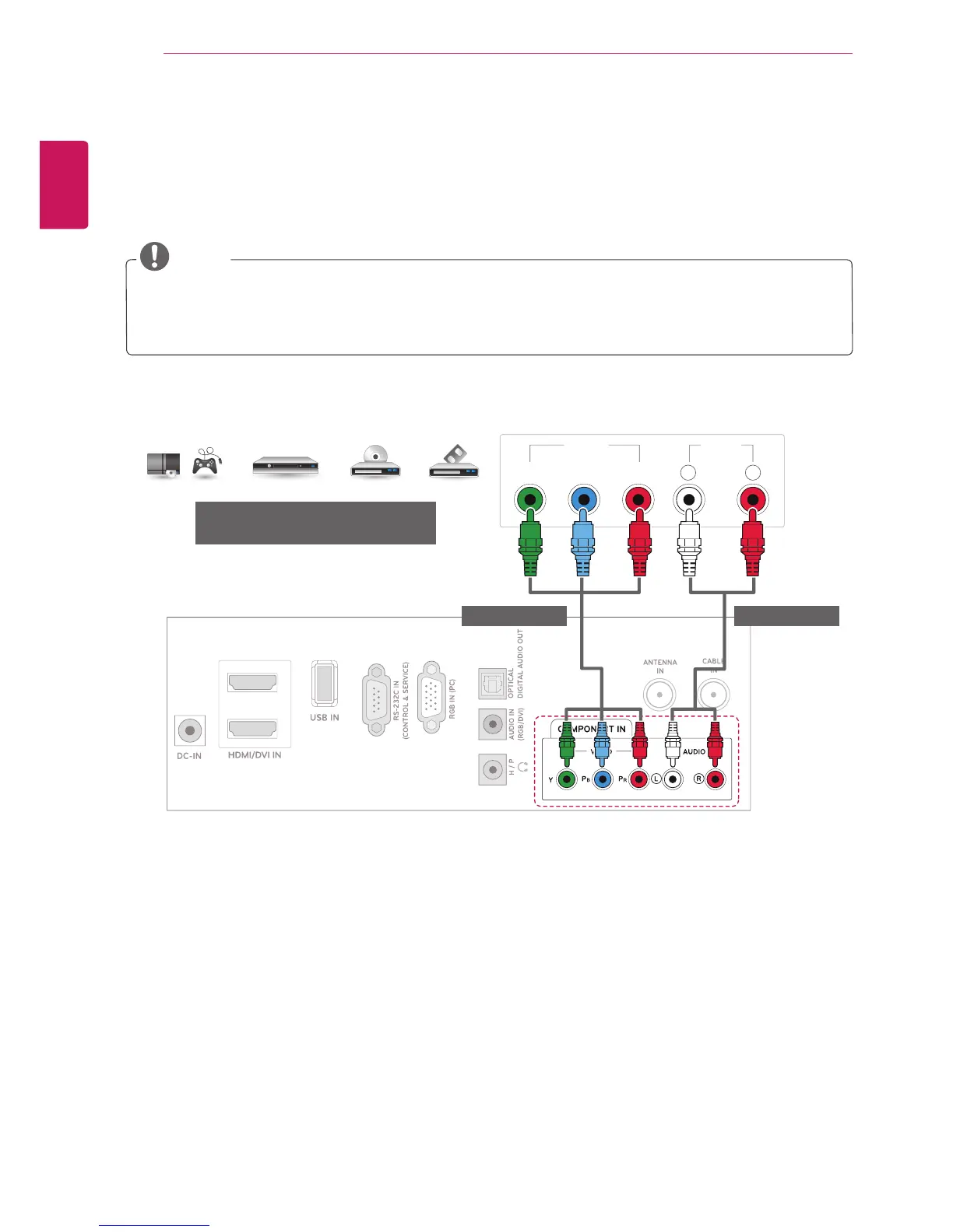 device and the TV with the component cable as shown on the following illustration. To display images by