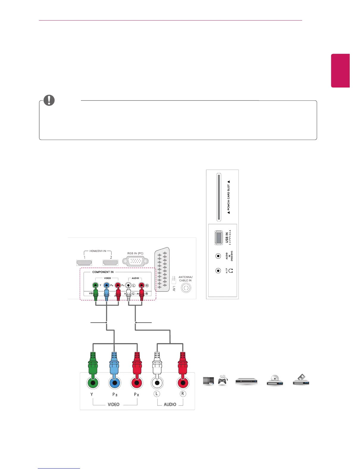 device and the TV with the component cable as shown on the following illustration. To display images by
