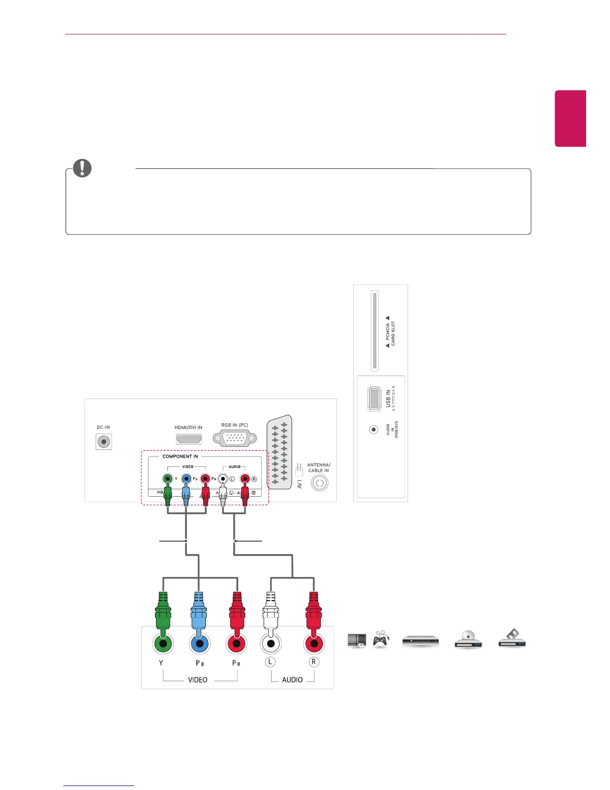 device and the TV with the component cable as shown on the following illustration. To display images by
