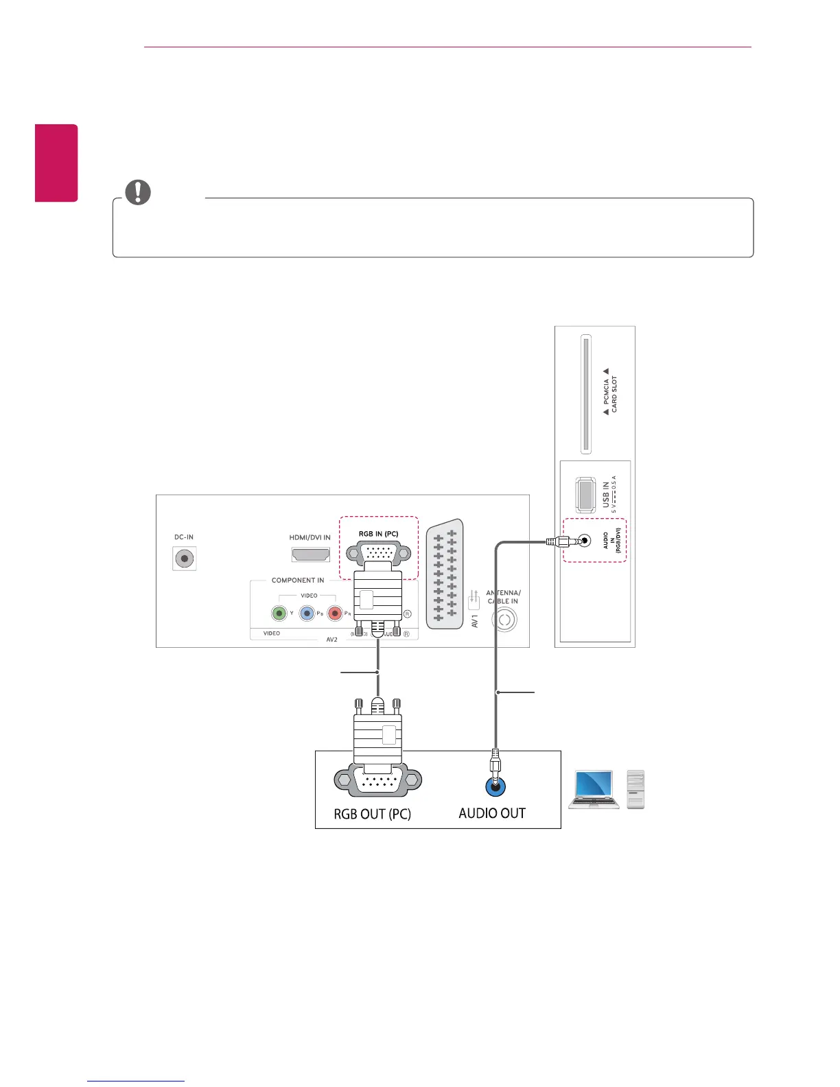 If you do not use an optional external speaker, connect the PC to the TV with the optional audio cable.