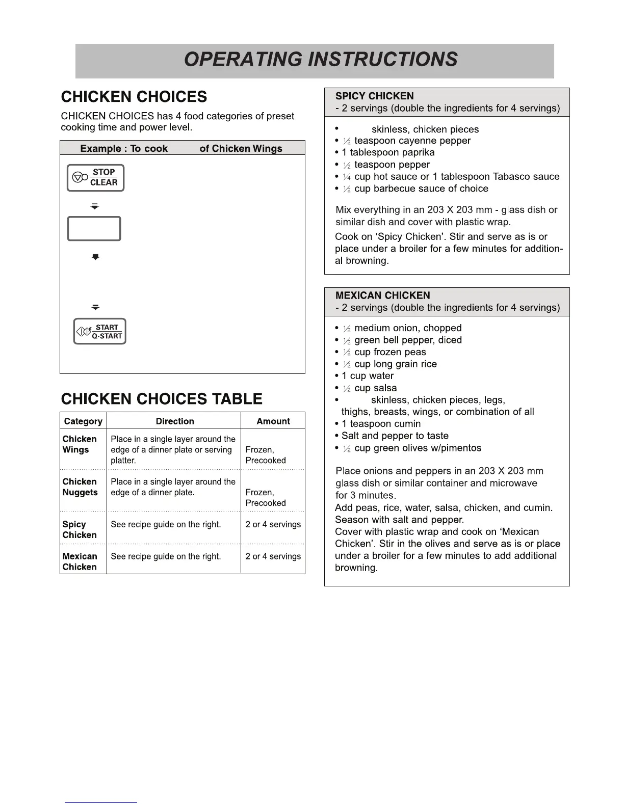 LG MS3840SR - Chicken Cooking Options; Chicken Choices Table