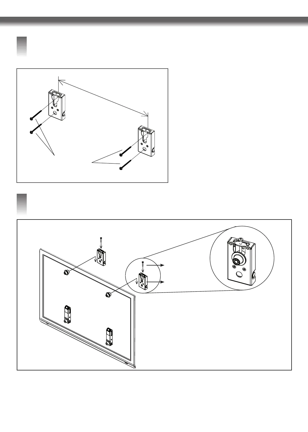 Assemble the guide spacers of the wall mounting bracket and the safety/horizontal alignment screws as shown in