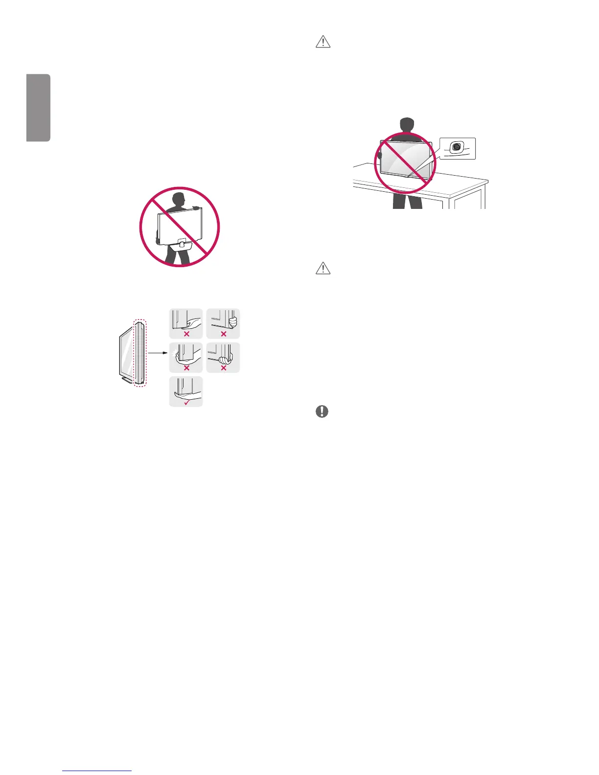 y Hold the top and bottom of the TV frame rmly. Make sure not to