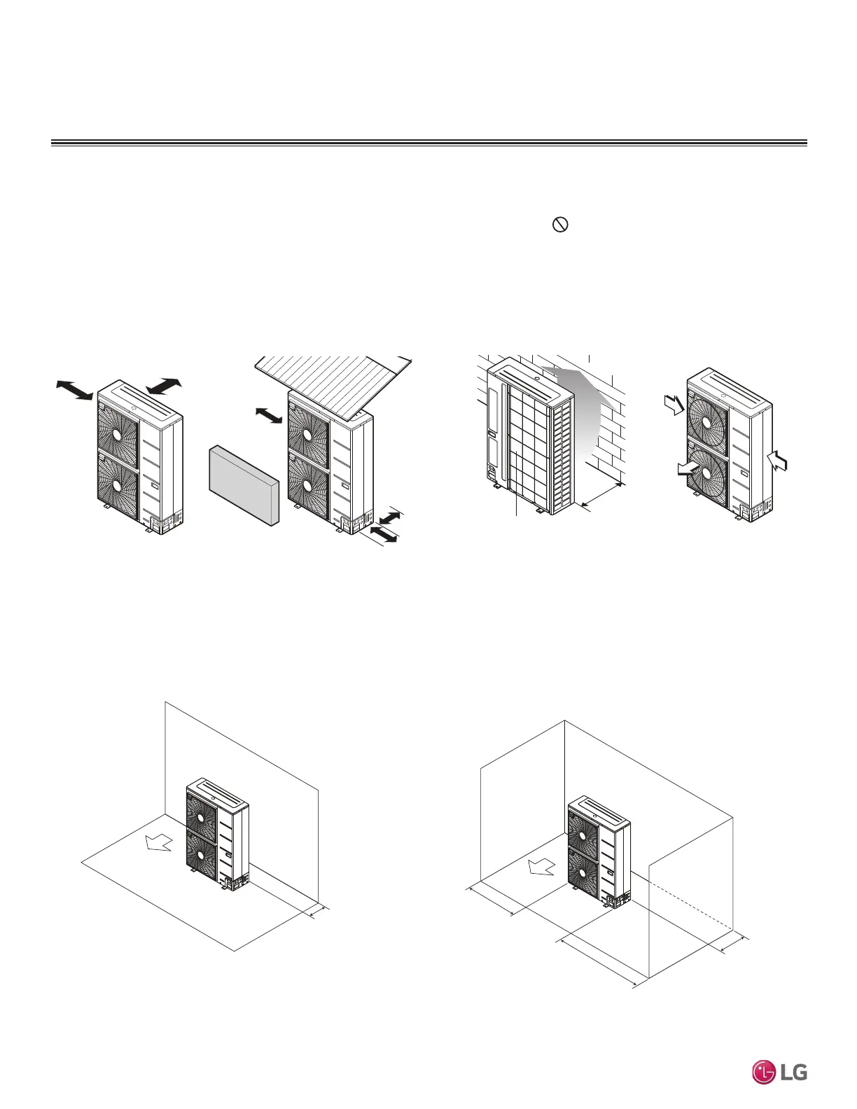 • Include enough space for airflow and for service access. If installing multiple outdoor units, avoid placing the units where the discharge