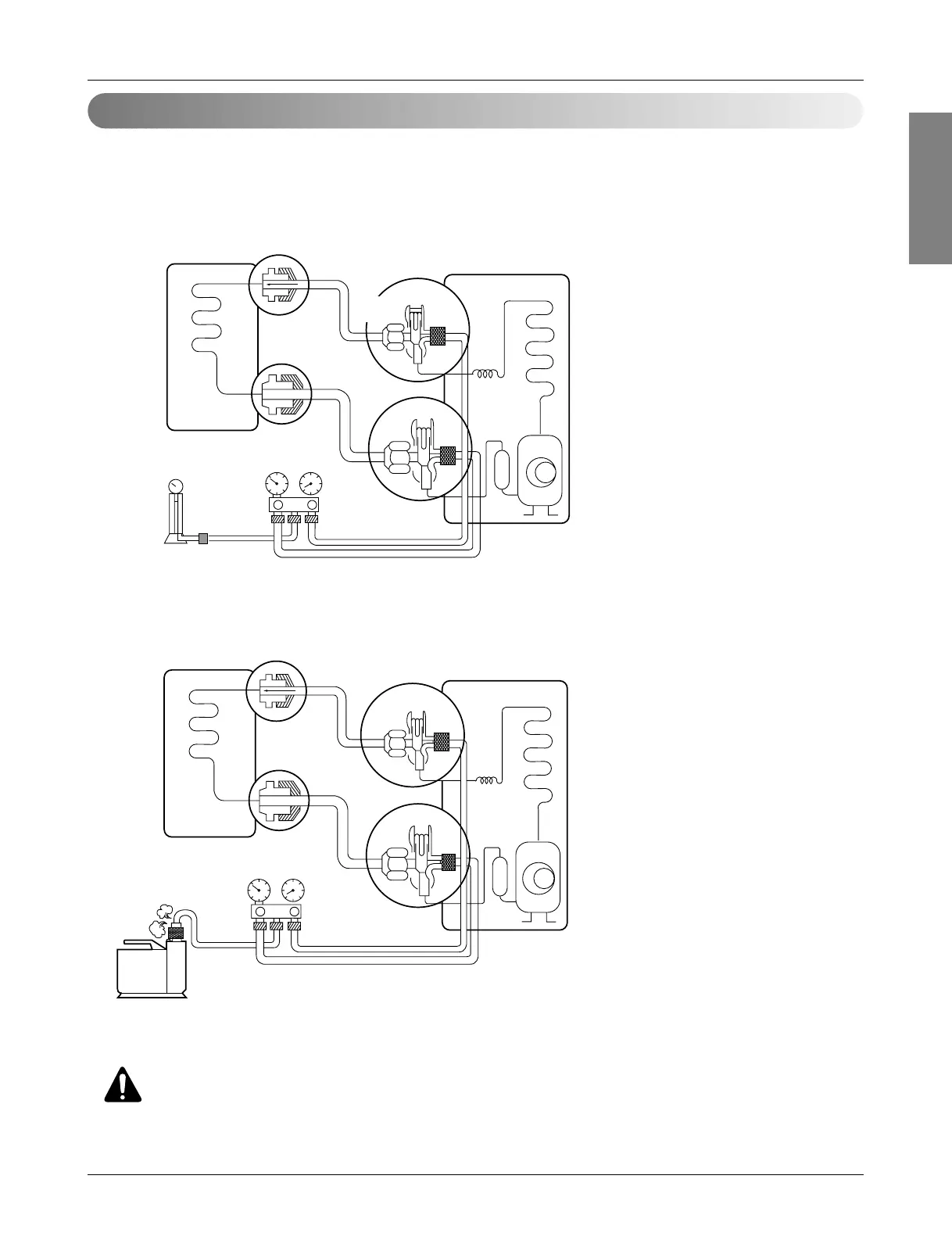 Evacuation should be made from the service port provided on the outdoor unit’s service valve to the vacuum