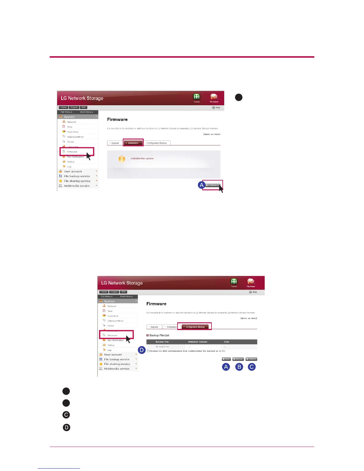 It is a function to back up/restore the set-up information of LG Network Storage at a