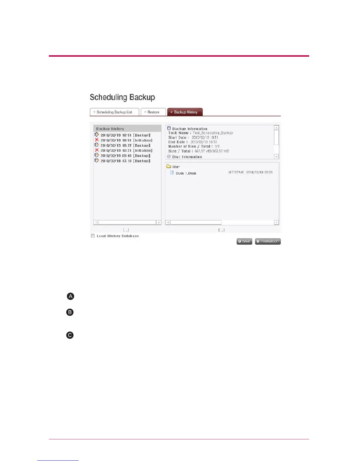 You check and manage history of backup and initialization on ‘Backup History’ menu.