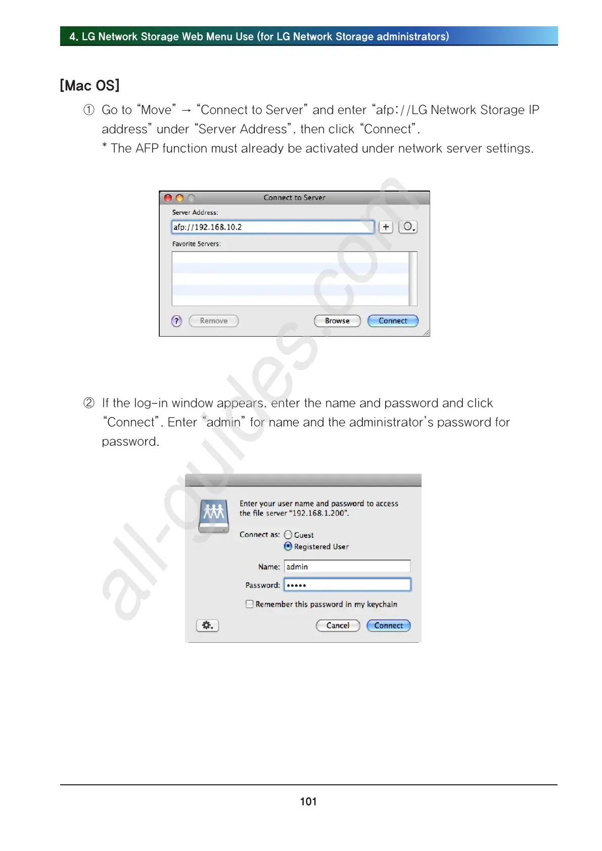 ① Go to “Move” → “Connect to Server” and enter “afp://LG Network Storage IP