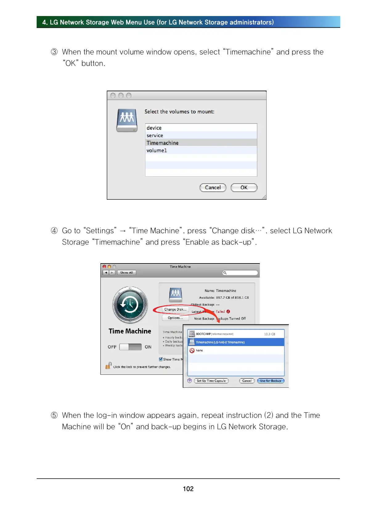 ④ Go to “Settings” → “Time Machine”, press “Change disk…”, select LG Network
