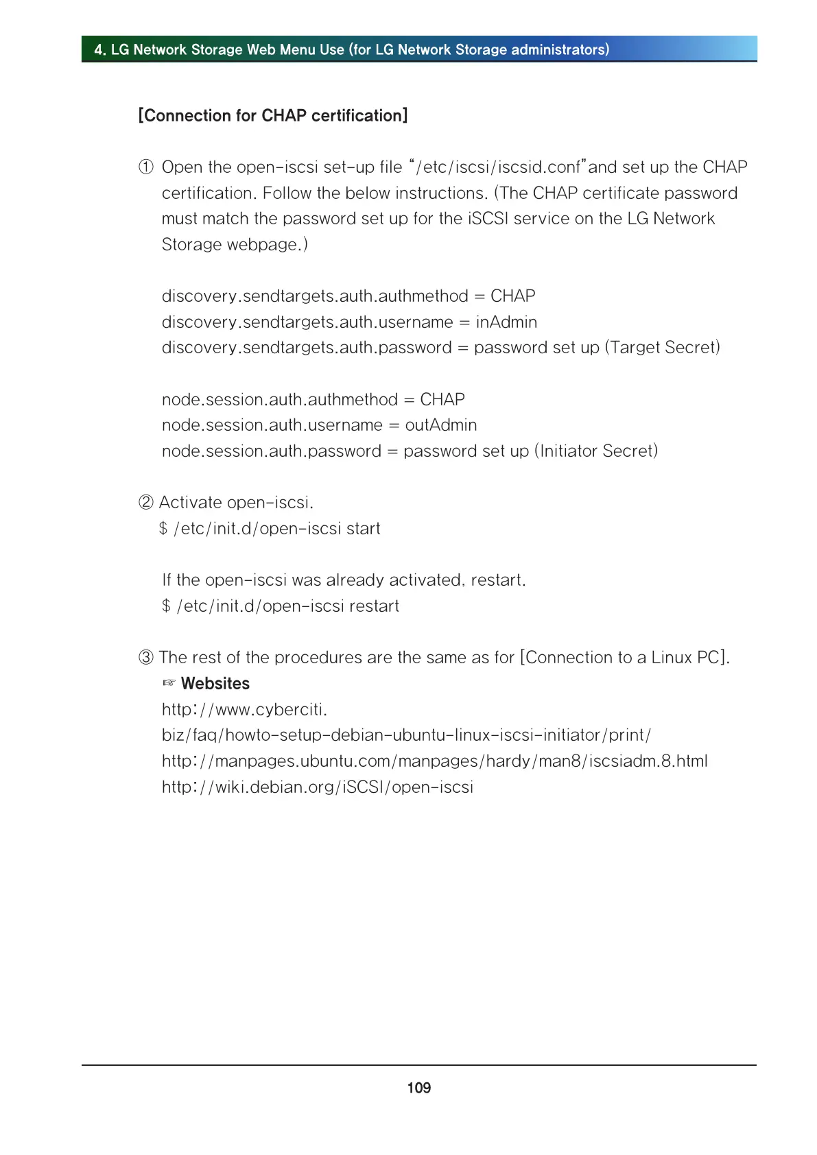 ① Open the open-iscsi set-up file “/etc/iscsi/iscsid.conf”and set up the CHAP