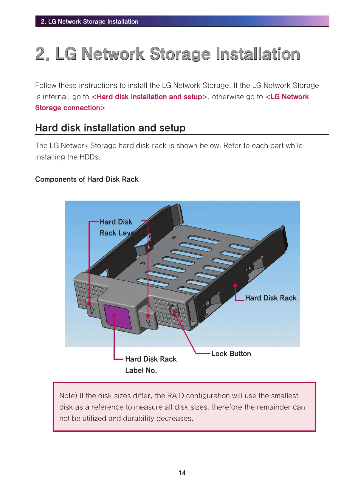 The LG Network Storage hard disk rack is shown below. Refer to each part while