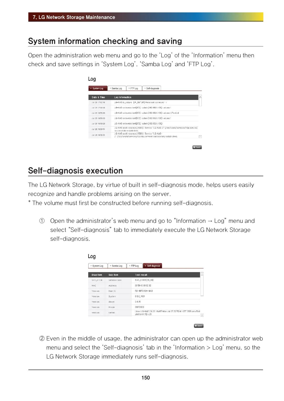 select “Self-diagnosis” tab to immediately execute the LG Network Storage