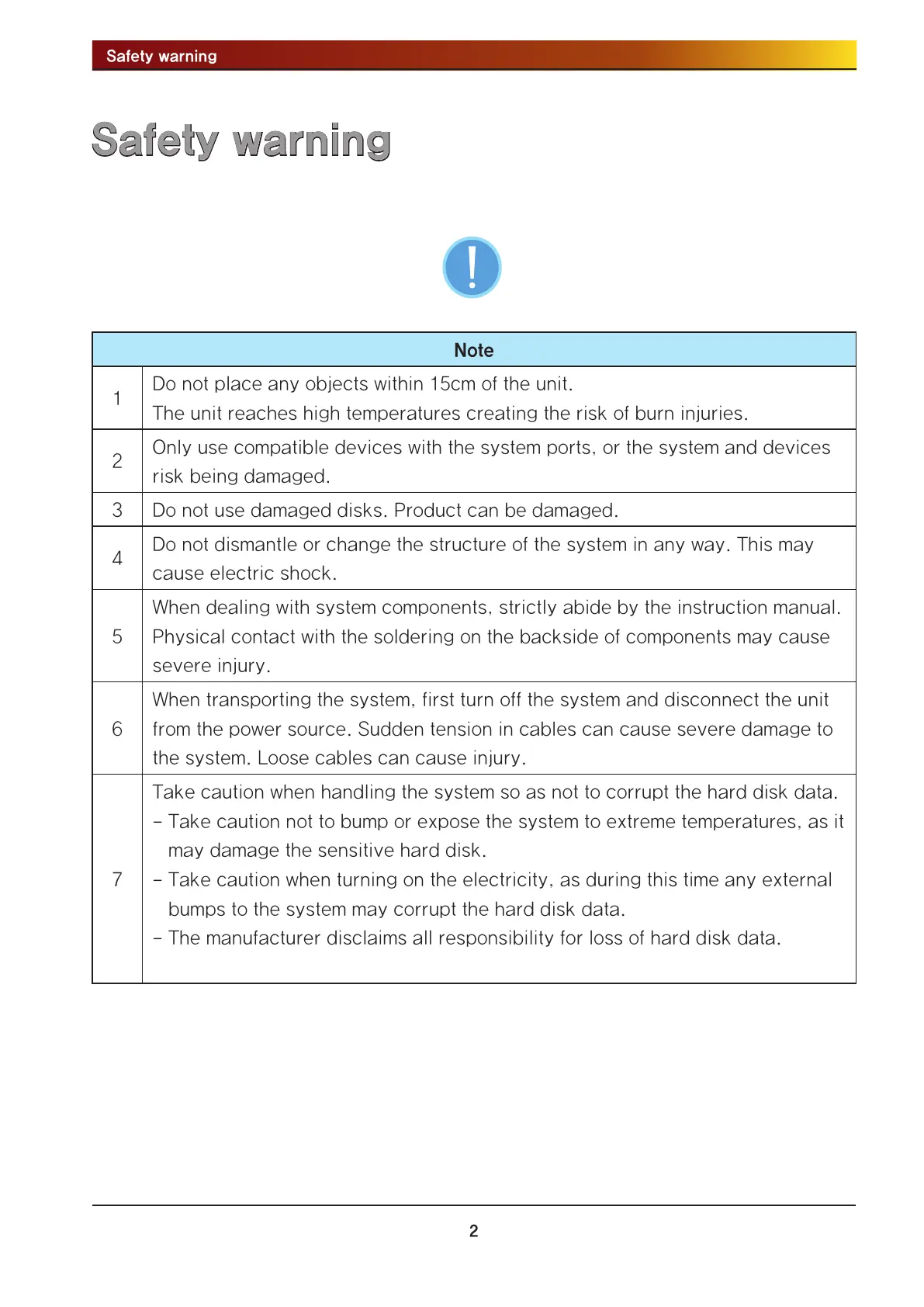 Take caution when handling the system so as not to corrupt the hard disk data.