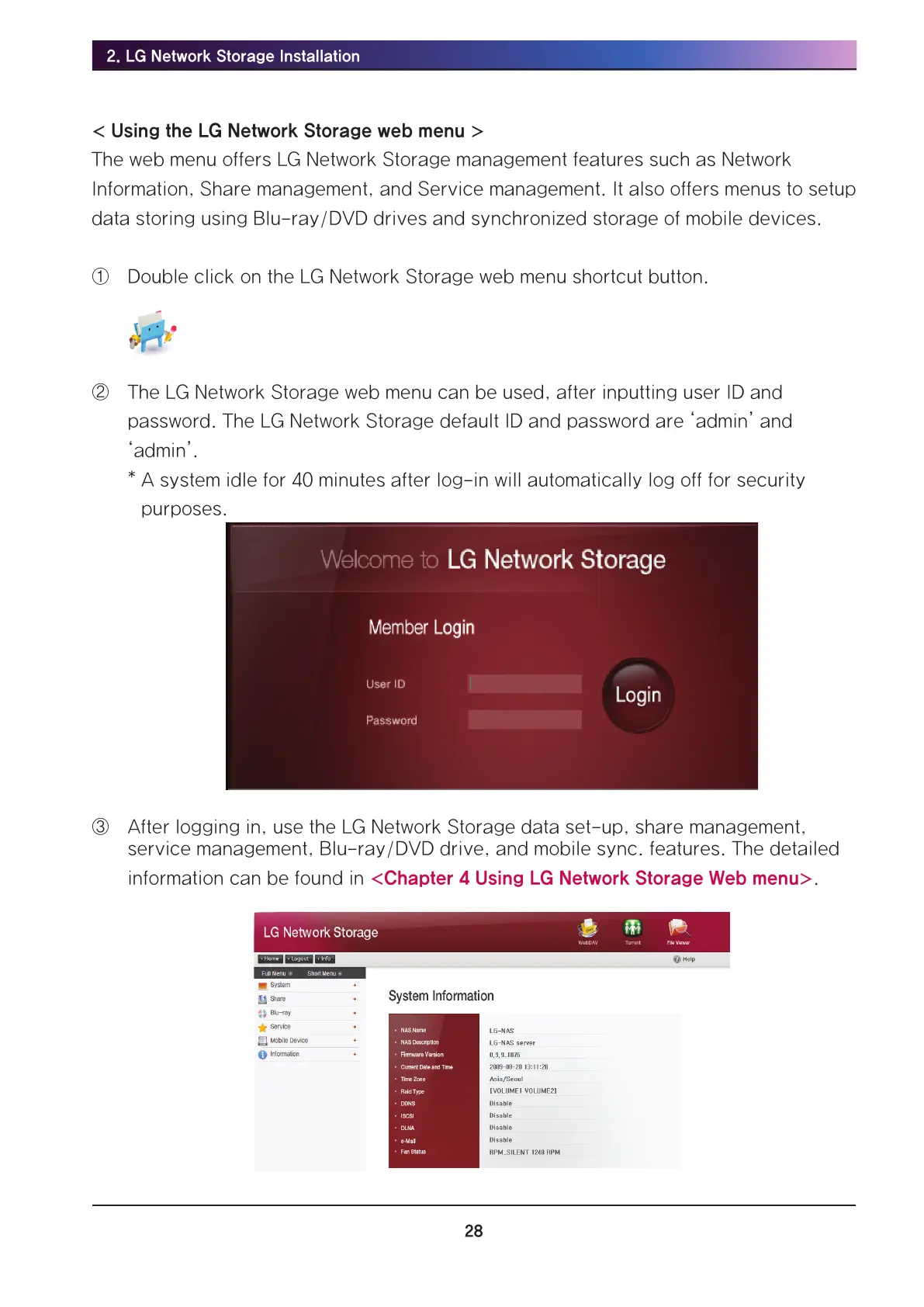 password. The LG Network Storage default ID and password are ‘admin’ and