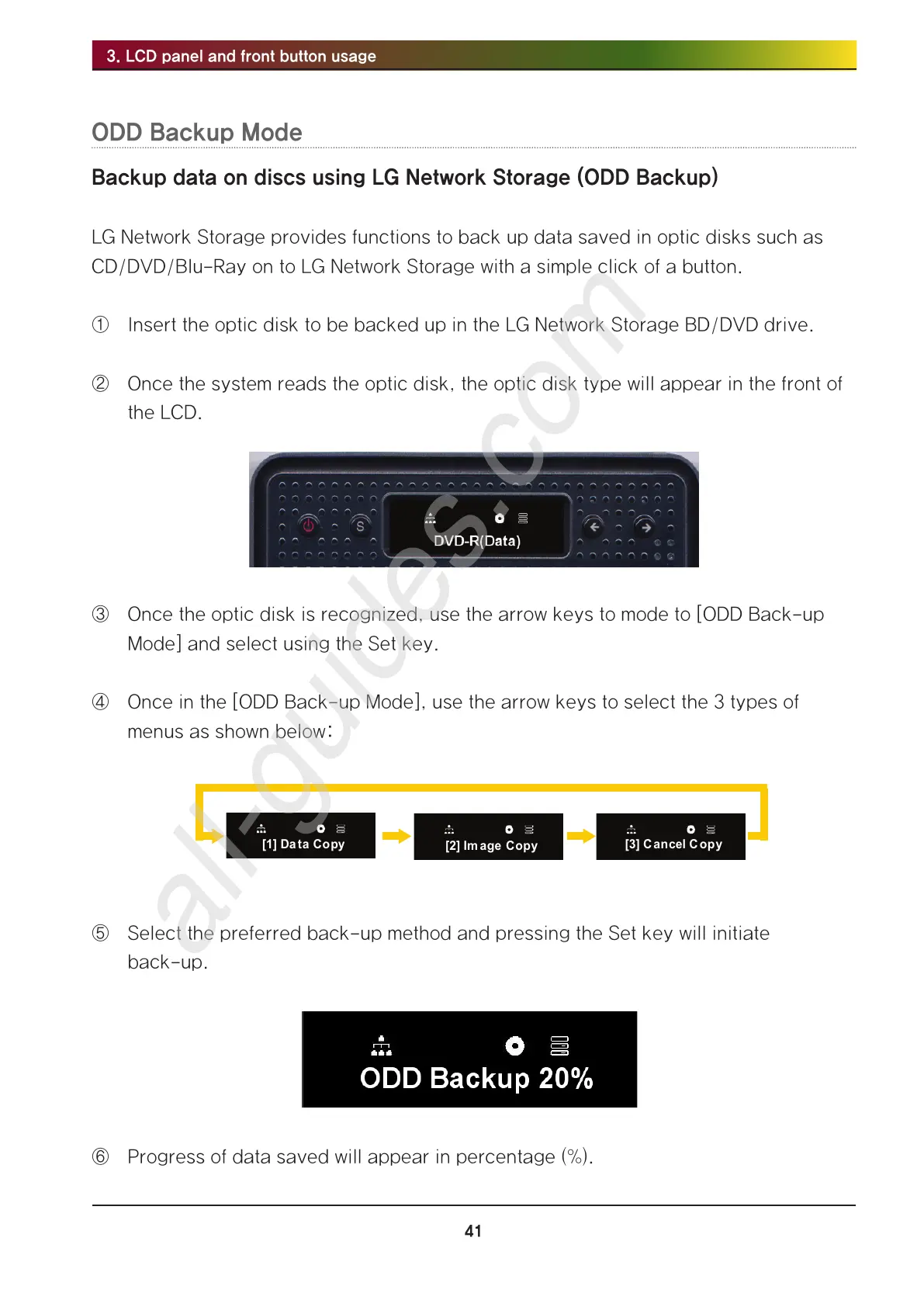 ④ Once in the [ODD Back-up Mode], use the arrow keys to select the 3 types of