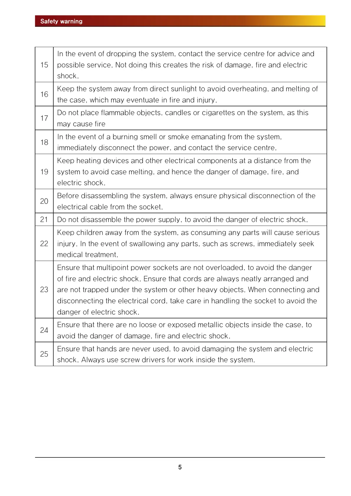shock. Always use screw drivers for work inside the system.