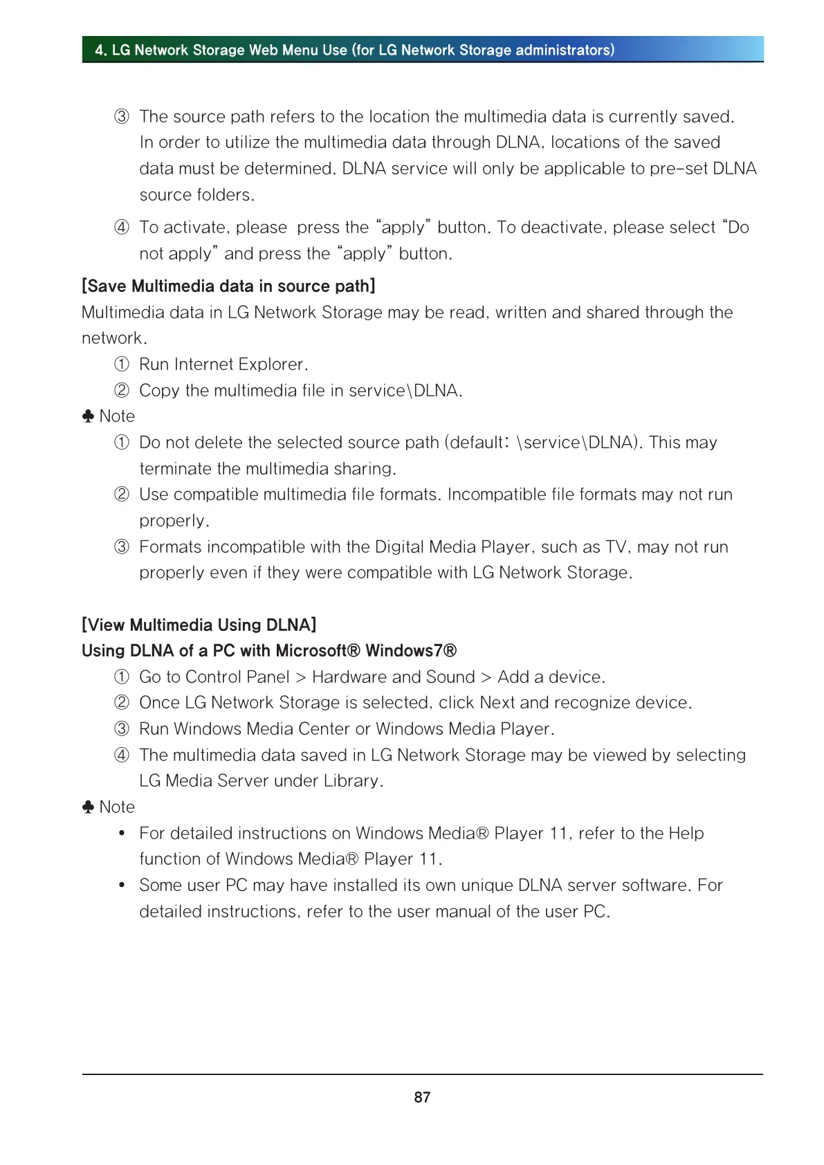 ① Do not delete the selected source path (default: \service\DLNA). This may