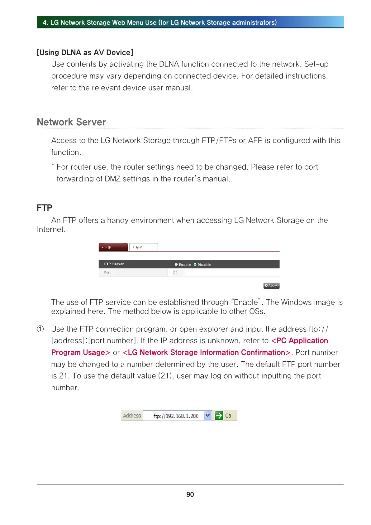 Access to the LG Network Storage through FTP/FTPs or AFP is configured with this
