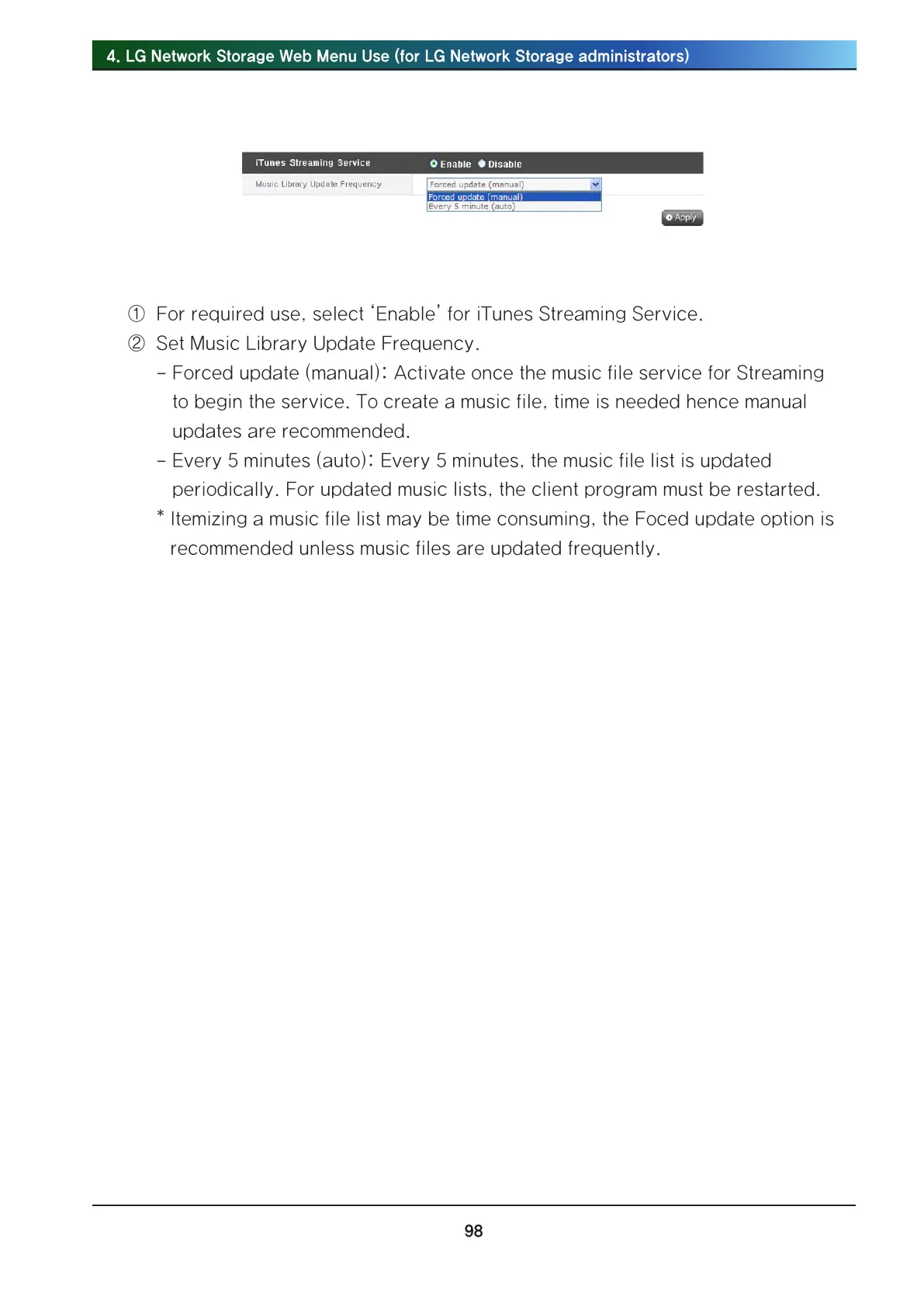 ① For required use, select ‘Enable’ for iTunes Streaming Service.